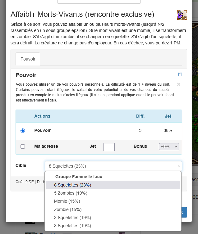 Affaiblir MV: le % en face de la cible prend en compte sa VOL puisque c'est un sort sur autrui et cela dépend de la cible, le calcul semble correct. Pour les zombies réduits en squelettes, j'ai corrigé (pour les prochains cas) pour que les caracs soient aussi modifiées correctement.[modéré par red