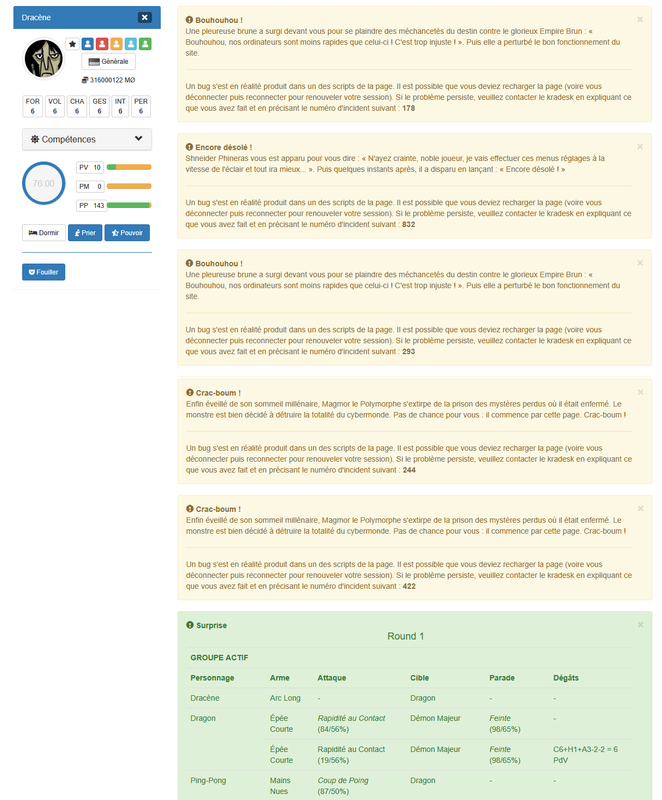 modéré 01/10 (13:32)J'ai corrigé le bug lié aux groupes vides : deux sous-groupes sont tués en même temps (ce qui arrive souvent avec boule de feu) et le programme s'emmêlait les pinceaux - c'est corrigé à présent.Je sais pas si c'est un bug de script ou si c'est dû au fait que j'ai fait monter mon perso en modifiant sa fiche mais j'ai eu pas mal de bugs vers les derniers niveaux de l'Antre de Naar.