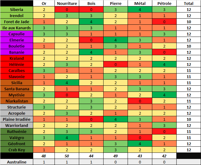 Pour l'or, on a fait ça à la fin pour équilibrer au sein des empires : pour chacun, la province qui galérait le plus a un cout d'extraction plus faible, et ceux déjà avantagées ont eu une augmentation du cout. Au final la somme de chaque empire fait 46. -