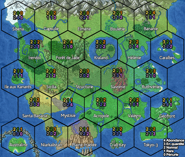 Pour chaque ressource, on laisse 2-3 provinces avec des taux d'extraction attractifs, environ la moitié avec des taux bas ou très bas, et le reste à la norme.