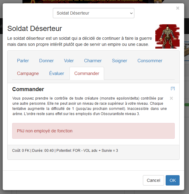 modéré 05/02 (18:48)En fait il s'agit d'un bug lors de l'enchantement soldat -> soldat déserteur ou la référence de fonction n'était pas effacée, bug corrigé depuis dans le sort, mais je n'ai pas corrigé les PNJ déjà présents. Là je lui ai retiré le marqueur fonction, donc il sera bien ton employé. J'ai aussi corrigé le message d'erreur pour qu'il soit plus explicite.Dans la caserne du quartier suprême (bureau) ya un soldat déserteur qui a comme employeur "ville Ville Inconnue"